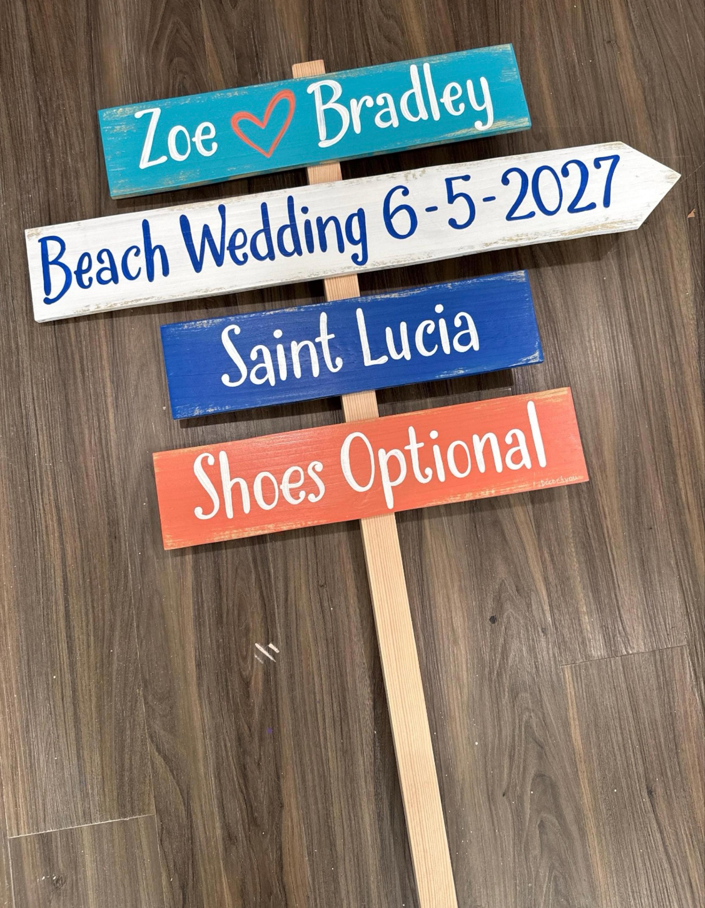 Beach wedding welcome directional sign. Guide guests to your destination beach wedding with our personalized direction sign. Add names and destinations for a fully customizable, unique, and lasting keepsake—perfect as a newlywed gift, beach wedding decor, and a fun way to indicate "shoes optional" for your guests.