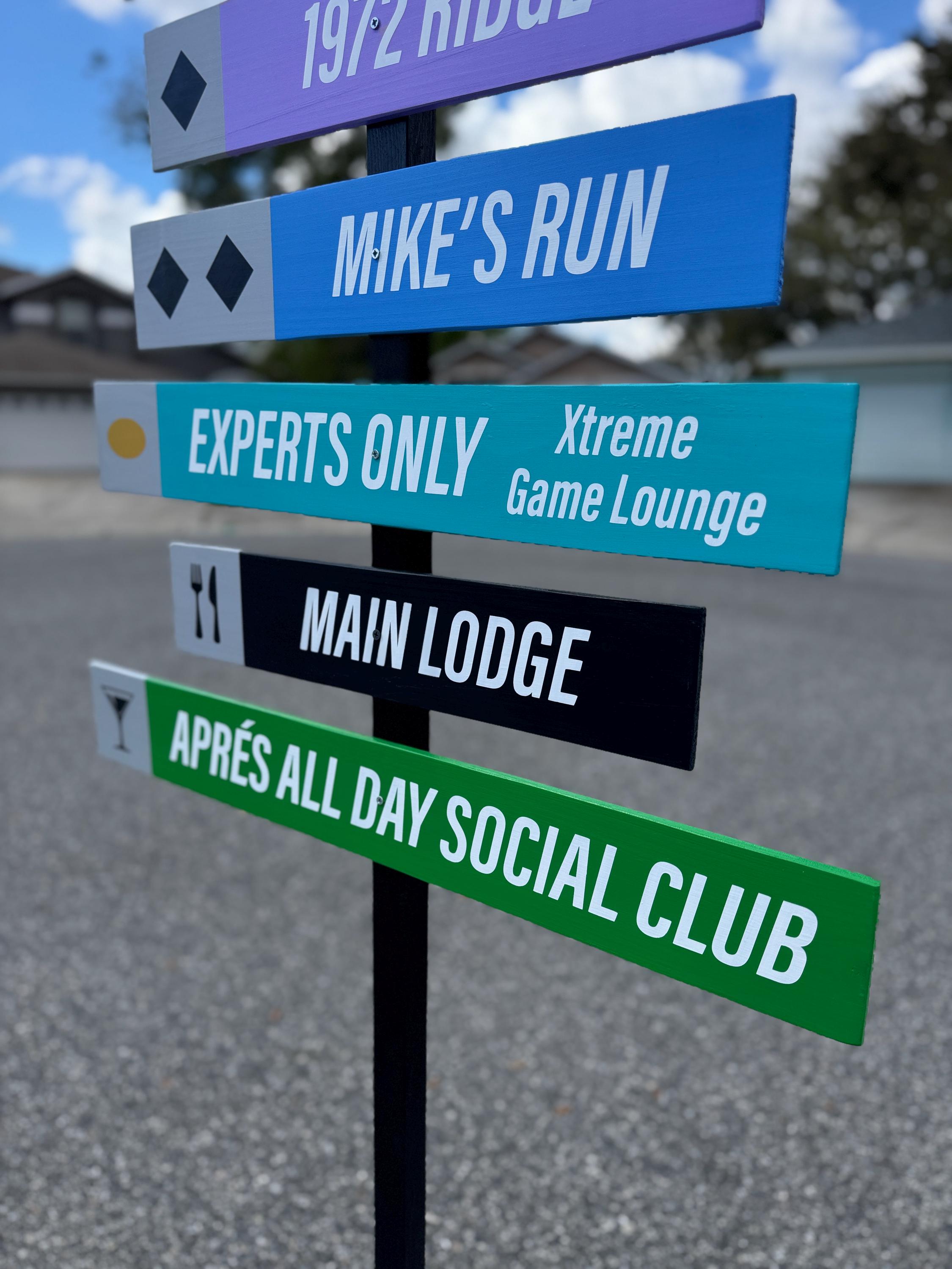 Bring the charm of a cozy mountain resort right into your home, event, or business with this handcrafted Ski Lodge Directional Sign. Designed to look like real ski trail markers, this standing sign features multiple colorful wooden arrows that can be customized with names, locations, activities, or fun ski-themed sayings.
