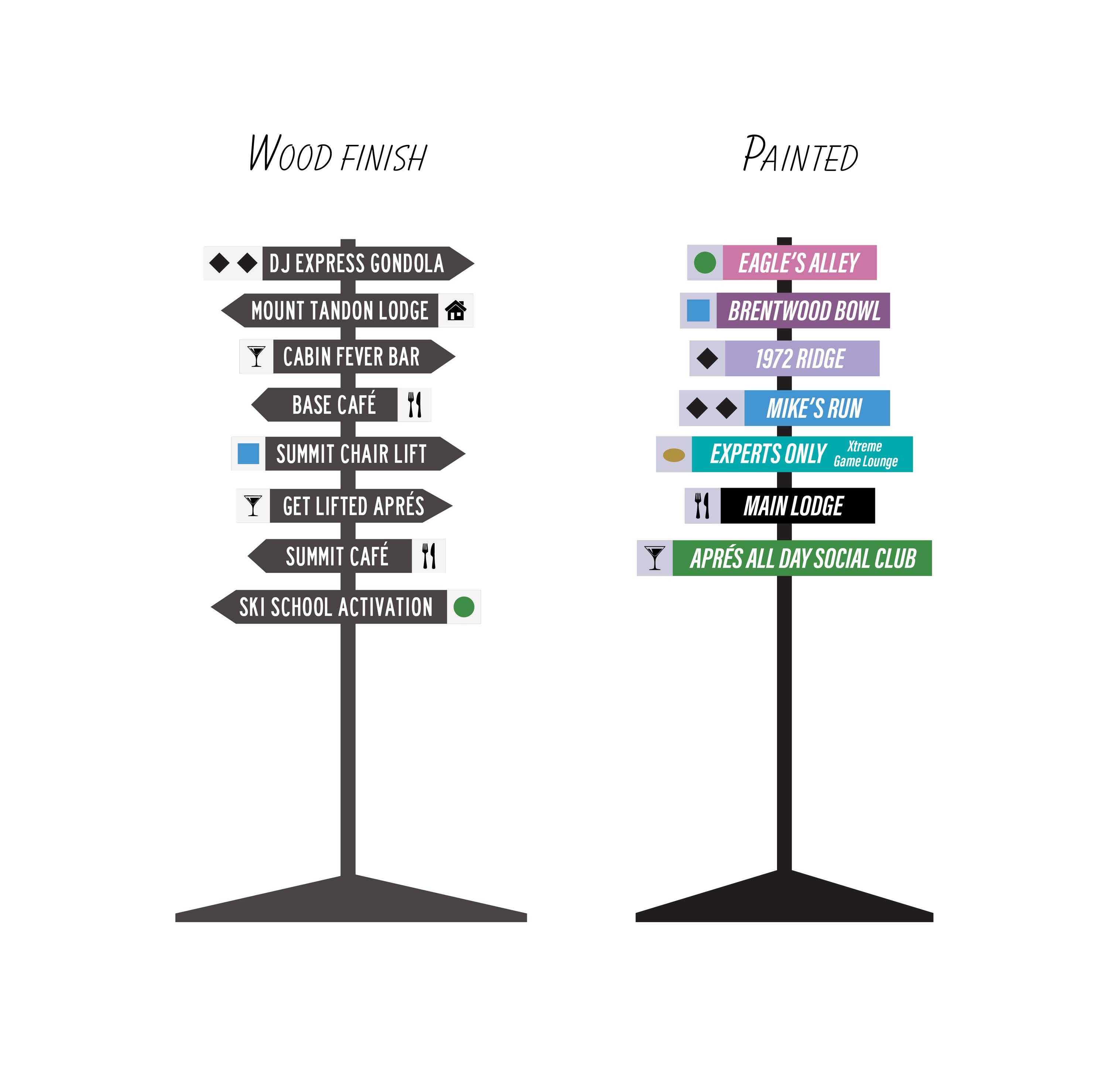 - Icons: Optional icons such as skis, martini, dining symbol, difficulty levels, dots & diamonds